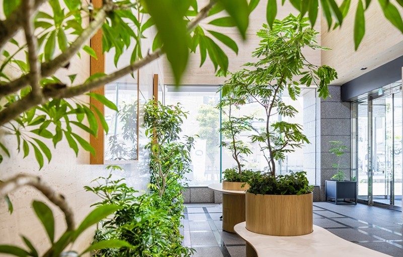 導入に至った理由は2つあり、ひとつはポラス本社ビルのエントランスにコモレビズを導入したところ、自然環境に近い空間にリニューアルし、社内外から好評だったこと。もうひとつは、研究に基づいた確かなエビデンスと、空間全体をバイオフィリックデザインで提案するコモレビズならではのサービスです。