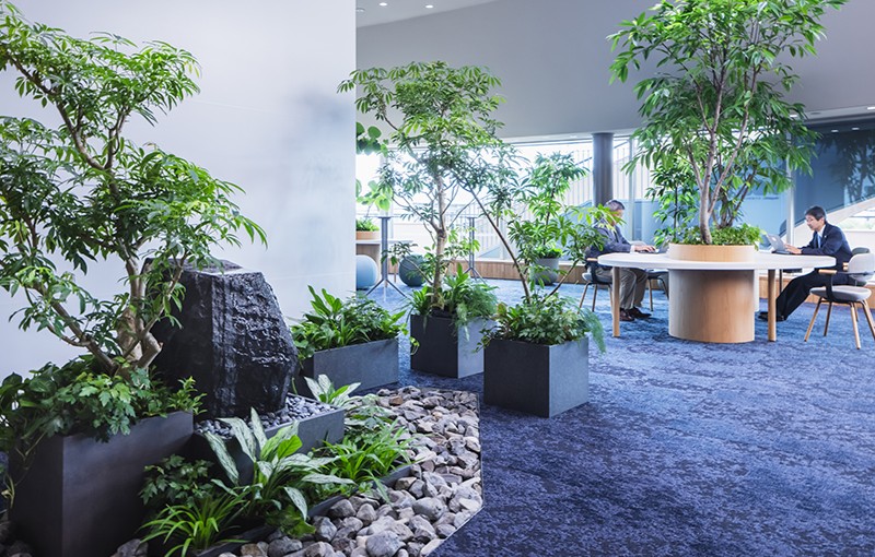 とくにこだわったのは植栽の配置場所。ストレスチェックの結果をもとに、部門ごとに従業員の視覚に入る場所に最適な緑視率の植栽が置けるよう、デザイン会社も含めて綿密に計画したそうです。