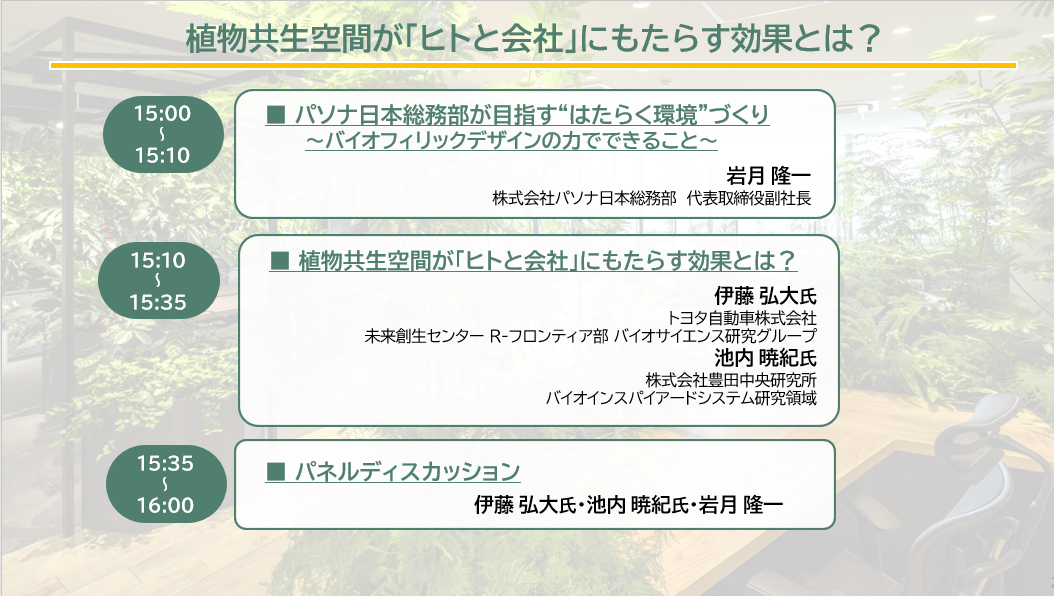 2025-11-19 オフラインセミナー「植物共生空間が『ヒトと会社』にもたらす効果とは?」開催レポ―ト 講師 岩月 隆一 株式会社パソナ日本総務部 代表取締役副社長 伊藤 弘大氏 トヨタ自動車株式会社 未来創生センター 池内 暁紀氏 株式会社豊田中央研究所 2025-12-05 共催Webセミナー「人材獲得・定着につながる職場とは~1時間でわかる健康経営に寄与する環境の作り方」開催レポート 講師 水口 拓也氏 福西電機株式会社 営業戦略統括部 ビジネスコネクト開発部 大久保 信昭 株式会社パソナ日本総務部 COMORE BIZ推進部 セールス&デザインチーム 営業リーダー 2025-11-19~11-21 オフィスに「癒しとひらめきの森」を ~コミュニケーション・リフレッシュ・リチャージで実現する”健康経営”の空間戦略~イベント開催レポート 会場 COREDO室町テラス 誠品生活日本橋イベントスペース内「FORUM」 2025-08-29 共催Webセミナー「企業に求められるウェルビーイングな職場づくり〜世界97ヵ国で拡がるWELL認証とは?~」 講師 湯井 健介氏 パナソニック 株式会社エレクトリックワークス社 ソリューションエンジニアリング本部 Well-Being事業開発室 岩田 大作氏 株式会社パソナ メディカル健康経営本部・メディカルDotank事業部長 大森 千尋 株式会社パソナ日本総務部 COMORE BIZ推進部 営業担当・インテリアコーディネーター 2025-06-25 共催Webセミナー「 “超・人材不足時代”に企業がやるべきこと~人が集い、力を発揮するワークプレイスづくり~ 」 講師 髙坂 昌幸氏 株式会社 USEN WORK WELL(U-NEXT.HD) オフィスソリューション事業部 リレーション営業部長 和田 えり子 コミュニケーション事業 推進本部 COMORE BIZ推進部 部長 2025-02-26 Webセミナー「パーパスを体現するワークプレースのつくりかた ~従業員の“自分ごと化”を叶えるオフィス事例~」 講師 大久保 信昭 株式会社パソナ日本総務部 COMORE BIZ推進部 プロモーションチーム 営業リーダー 和田 えり子 株式会社パソナ日本総務部 COMORE BIZ推進部 部長 2024-12-13 Webセミナー「ウェルビーイング×最新技術でオフィスを共創空間に! ~バイオフィリアとxRの力で創造する新しいワークプレース体験~」 講師 坂井 剛氏 パナソニック ホールディングス株式会社 技術部門DX・CPS本部デジタル・AI技術センター ヒューマンテックソリューション部 主幹技師 和田 えり子 株式会社パソナ日本総務部 COMORE BIZ推進部 部長 丸森 浩実 株式会社パソナ日本総務部 DXサービス開発部 マネージャー 2024-10-02 Webセミナー「導入企業に訊く!ウェルビーイングな環境づくり ~バイオフィリックデザインの最適な取り入れ方と効果~」 講師 江尻 宏太氏 株式会社エム・シー・ファシリティーズ オフィスソリューション本部 コンサルティング事業部長 赤羽 優莉佳氏 株式会社エム・シー・ファシリティーズ ファシリティマネジメント本部 オフィスマネジメント部(兼)本店オフィスプロジェクト室 杉尾 萌 株式会社パソナ日本総務部 COMORE BIZ推進部 2024-10-03 JX金属株式会社様にて「オフィス見学会」を開催 会場 JX金属株式会社様オフィス 2024-06-28 Webセミナー「バイオフィリアとコミュニケーション~社内交流を生み出すしかけづくり~ 」 講師 岩崎 寛氏 千葉大学大学院園芸学研究院 教授 和田 えり子 株式会社パソナ日本総務部 COMORE BIZ推進部 部長 藤野 尚志 株式会社パソナ日本総務部 イベントサービス推進部 マネージャー 2024-01-25 都会で森林浴!「ミニGenki-Office体感イベント」開催レポート 会場 東京・南青山の情報発信イベントスペース「Annex Aoyama」 2024-01-25 Webセミナー「ウェルビーイングのカギは植物にあり!パソナ日本総務部・トヨタが研究する“ヒトをGenkiにする空間”とは」開催レポート 講師 岩月 隆一 株式会社パソナ日本総務部 代表取締役副社長 伊藤 正和氏 トヨタ自動車株式会社 未来創生センター R-フロンティア部バイオ研究領域 領域長 池内 暁紀氏 株式会社豊田中央研究所 バイオインスパイアードシステム研究領域 主任研究員 2023-08-29 共催Webセミナー「ハイブリッドワークに対応するために企業がすべきこと」~デジタルとバイオフィリックデザイン~開催レポート 講師 和田 えり子 株式会社パソナ日本総務部 COMORE BIZ推進部 部長 小森 玲奈氏 株式会社レスターコミュニケーションズ 第三営業部門 システム営業部 統括部長 2023-12-11 共催Webセミナー「従業員のWell-beingを実現するオフィスとは?」開催レポート 講師 豊澄 幸太郎氏 パナソニック株式会社 エレクトリックワークス社 Wellマーケティング・営業推進部 主幹 渡辺 愛子氏 パナソニックEWネットワークス株式会社 ワークプレイス事業推進部 2023-09-14 仙台市主催・令和5年度百年の杜フォーラム 登壇レポート 講師 岩崎 寛氏 千葉大学大学院 園芸学研究科 環境健康学領域 准教授日本園芸療法学会認定 上級園芸療法士 日本緑化工学会副会長 亀崎 英治氏 公益財団法人 みやぎ・環境とくらし・ネットワーク スタッフ 2022-02-10 「PASONA Wellness EXPO ウェルネスを実現し、生産性を高めるこれからの職場づくりとは