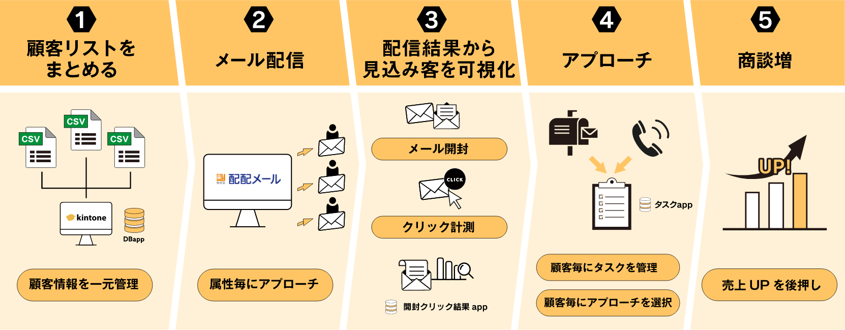 既存顧客リストを※kintoneで一元管理することで、手軽にマーケティング施策を実行できます。